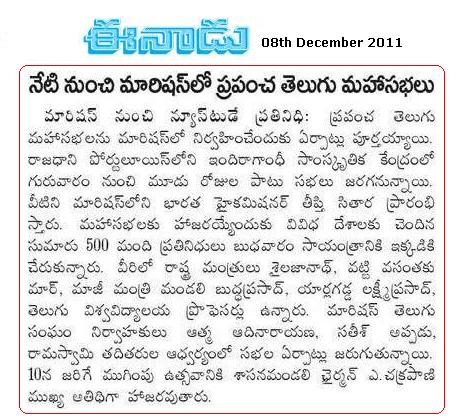 Representatives from India, USA, Malaysia, South Africa, Fiji, UK and Mauritius attended the meeting. Mauritius minister Deva Veera Swamy, who has his roots in Andhra Pradesh, said Telugus in Mauritius were heirs of labourers who migrated to the country some 150 years ago.